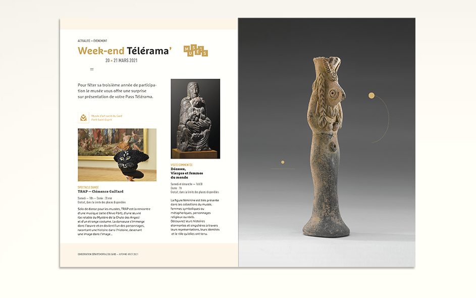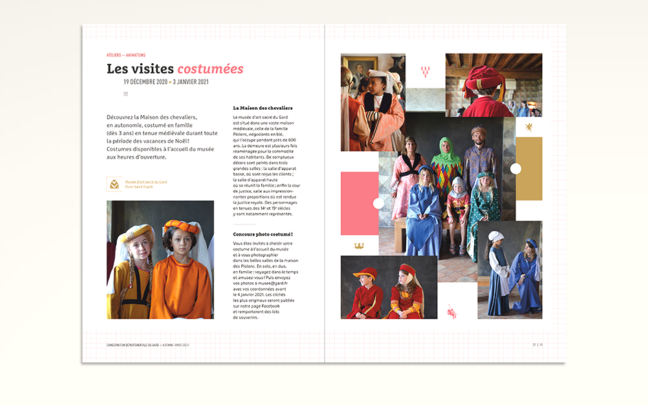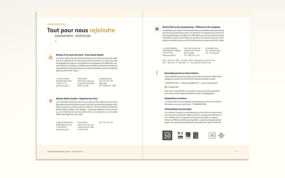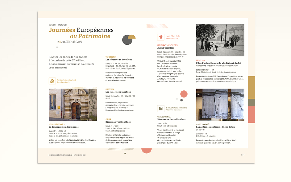 Jusqu’en 2022, la programmation culturelle de la conservation des musées du Gard était très riche et diversifiée. La conservation c’était un musée départemental situé à Pont-Saint-Esprit, deux musées à Bagnols-sur-Cèze et un musée à Villeneuve-les-Avignon. Chaque année, 4 à 6 expositions temporaires, des événements nationaux (journées du patrimoine, nuits des musées, nuits de la lecture, …), des ateliers, des conférences toutes les semaines, un cycle en biennale, des jeux et activités découvertes pour les enfants de tous âges, des visites thématiques, des coopérations diverses… La conservation ne disposait jusque là d’aucun support transversal permettant d’avoir une vue globale sur la totalité de sa programmation. Cette nouvelle brochure semestrielle, véritable outil de développement du territoire, aura le mérite de mettre en avant le travail des équipes du département autant que d’attirer encore plus de visiteurs tout en fidélisant les habitués.