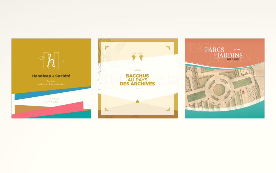 Les Archives départementales du Gard mettent en place de petites expositions documentaires itinérantes sur la base de leur fonds. L’ensemble signalétique sous forme de banners est aussi reproduit sur de petits catalogues gratuits. Les thématiques sont nombreuses et toujours finement choisies pour une vulgarisation d’intérêt pour le grand public et les jeunes gardois. L’histoire de la viticulture avec Bacchus au pays des Archives, Figures gardoises pour découvrir ces gardois qui ont fait le monde au-delà du territoire, Handicap et sociétés, Cartes et territoires ou encore Parcs et jardins du Gard…