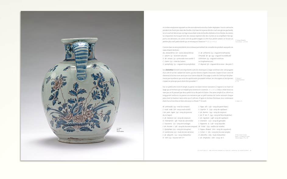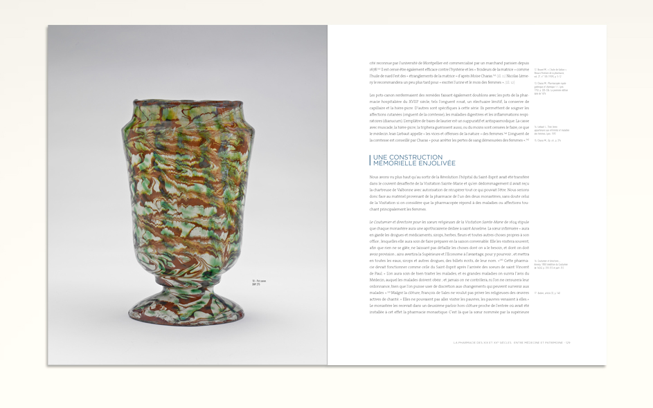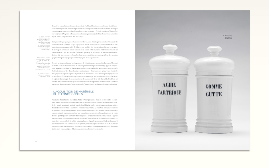 L’histoire de l’art a longtemps considéré — et considère encore pour certains — les pots de pharmacie comme une production mineure, de surcroît faite en série, concédant à quelques rares récipients fonctionnels un caractère artistique. Réduire une apothicairerie hospitalière à son meuble et aux pots qu’il abrite reviendrait à se priver de vouloir donner à la réalité factuelle livrée par cette seule source cohérence et sens afin de la rendre intelligible. C’est pourquoi cette étude est placée sous le signe de la durée, qui permet d’étudier ce qui vient de loin, ce qui demeure et ce qui est nouveau, afin de tenter de comprendre la façon dont s’articulent les faits, les idées, les croyances. Une apothicairerie hospitalière est indissociable du fonctionnement quotidien de l’établissement pour lequel elle a été conçue. Elle en est le reflet. Photographies : M. Daspet et JL. Maby. Couverture rembordée Cousu — 160 pages + 4 — 230X280 mm.